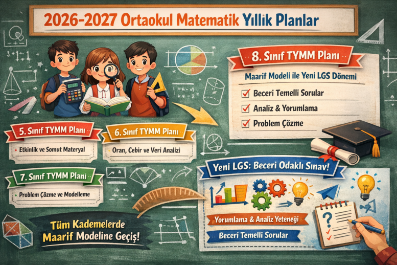 2026-2027 eğitim öğretim yılı, ortaokul matematik öğretiminde önemli bir dönüşümün tamamlandığı bir dönem olacaktır. Bu yılla birlikte 5, 6 ve 7. sınıflarda TYMM (Türkiye Yüzyılı Maarif Modeli) doğrultusunda hazırlanan yeni müfredata uygun yıllık planlar uygulanmaktadır. 8. sınıfların bu yıl mezun olmasıyla, 2026-2027’den itibaren ortaokulun tüm kademelerinde Maarif Modeli’ne tam geçiş sağlanmış olacaktır. Bu değişim; kazanım yapıları, ölçme-değerlendirme anlayışı ve ders işlenişinde daha beceri temelli, günlük yaşamla ilişkili bir matematik öğretimini hedeflemektedir.